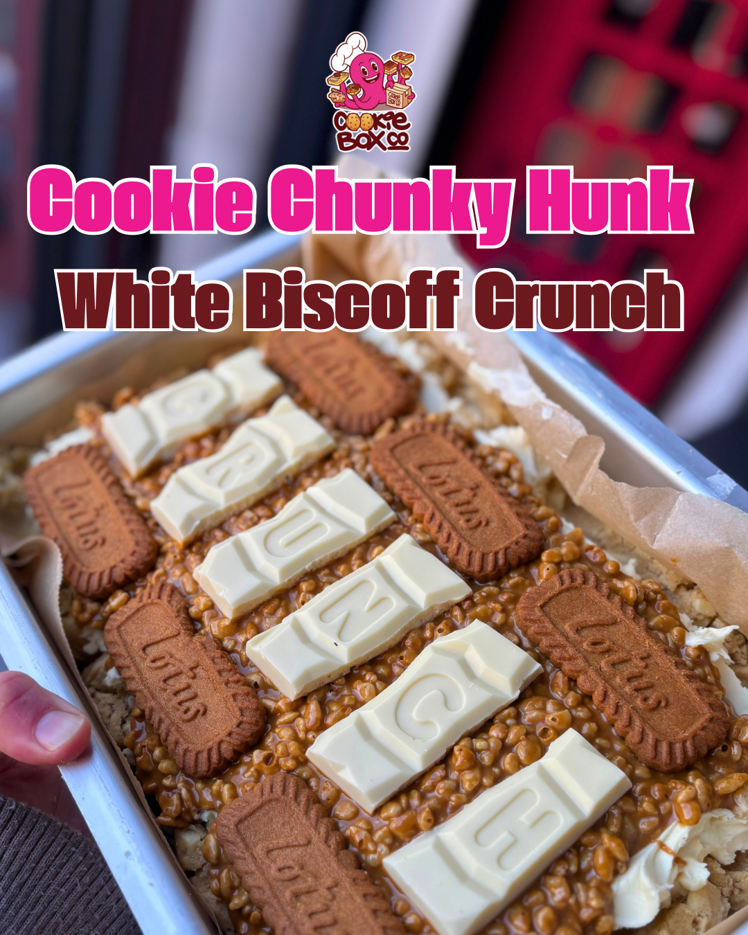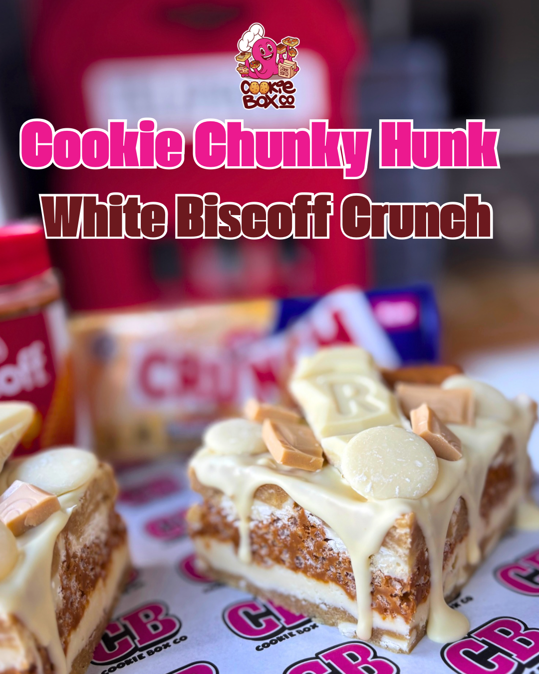 A white chocolate cookie dough base layered with MilkyBar ganache, and then a Biscoff krispy cake layer Biscoff biscuits and chunks white crunch bar