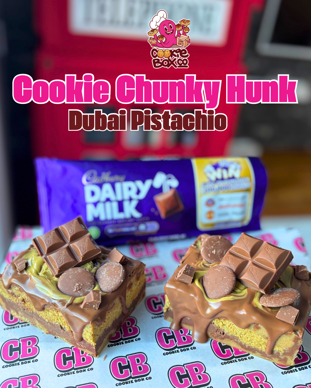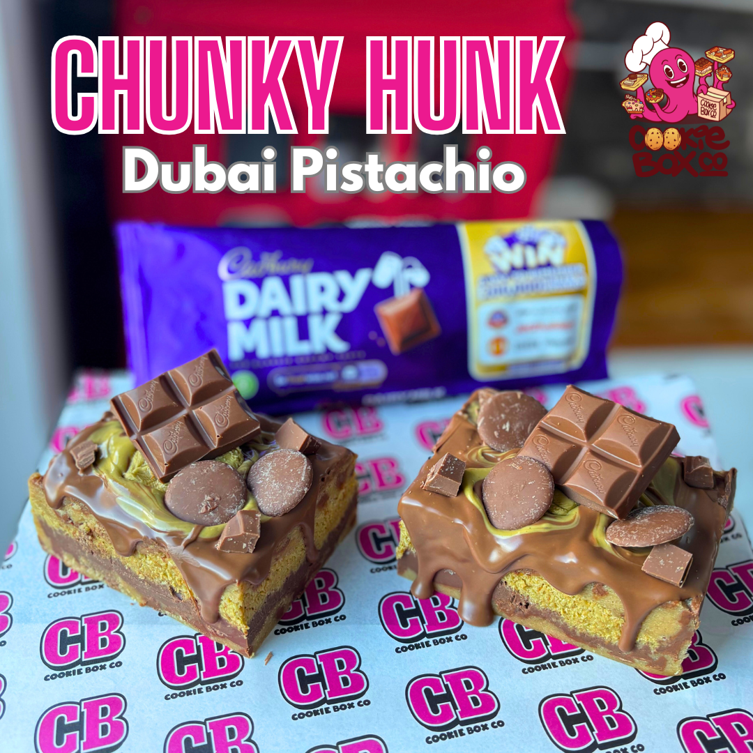 A milk chocolate cookie dough chunky hunk layered with dairy milk ganache then a thick layer of pistachio kunafa which features in the Dubai viral chocolate bar. Topped with milk chocolate, pistachio swirl and chunks of Dairy milk chocolate. This levels up the viral sensation - when Cookie Box cookie 🍪 takes on the world’s fav!