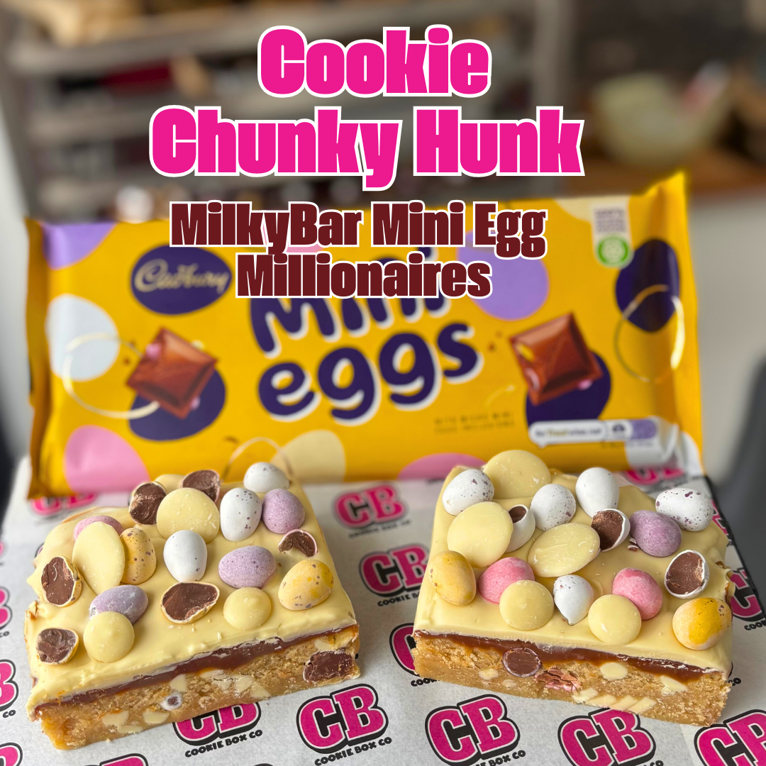 Cookie dough studded with Mini Eggs topped with homemade caramel, MilkyBar and loads of Mini eggs and MilkyBar buttons