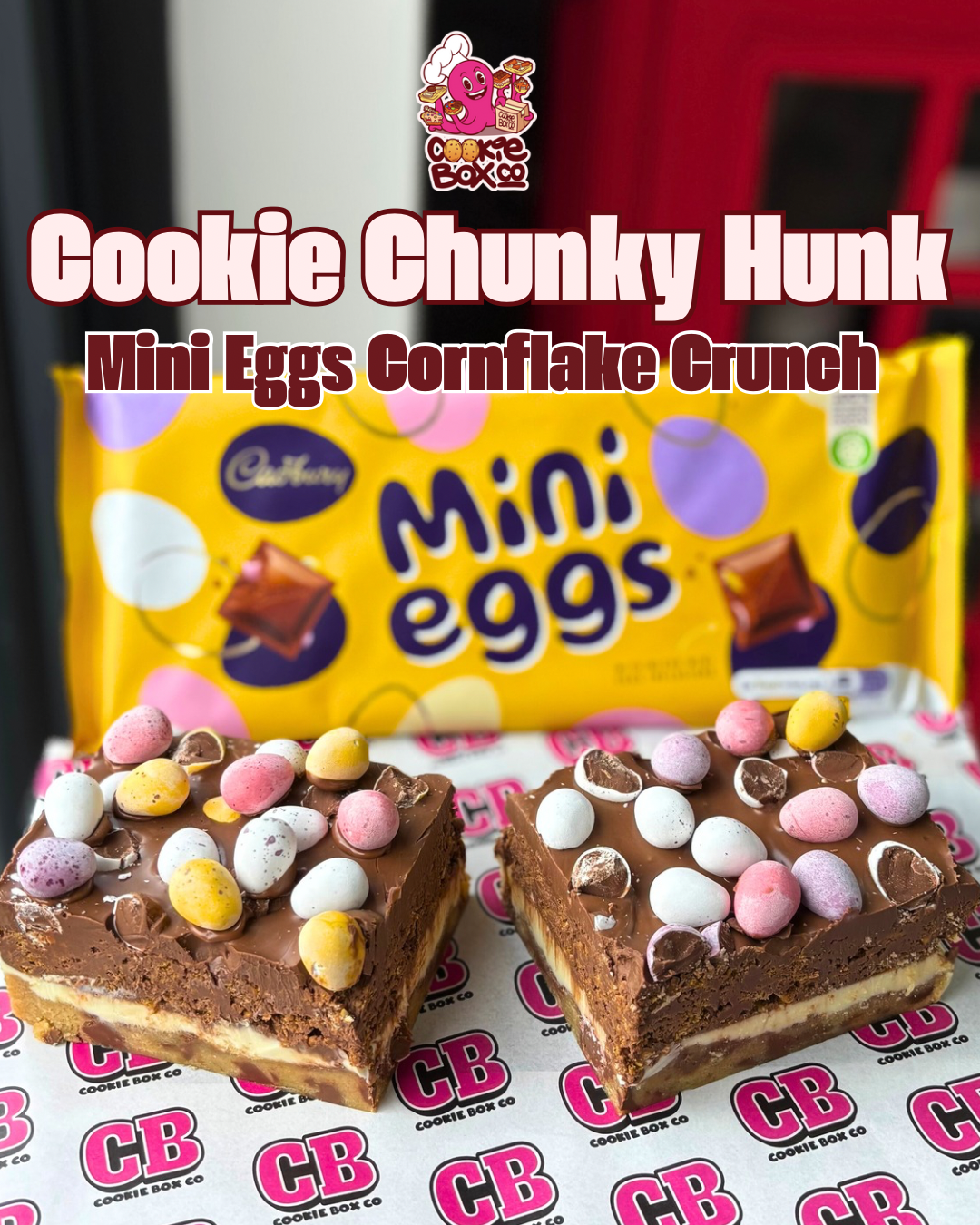 A milk chocolate cookie dough based laced with Cadburys Mini eggs chunks. On top of this a thick layer of MilkyBar ganache. Topped with the old school classic cornflake cake with an addditonal layer of mil chocolate and crushed mini eggs and whole mini eggs