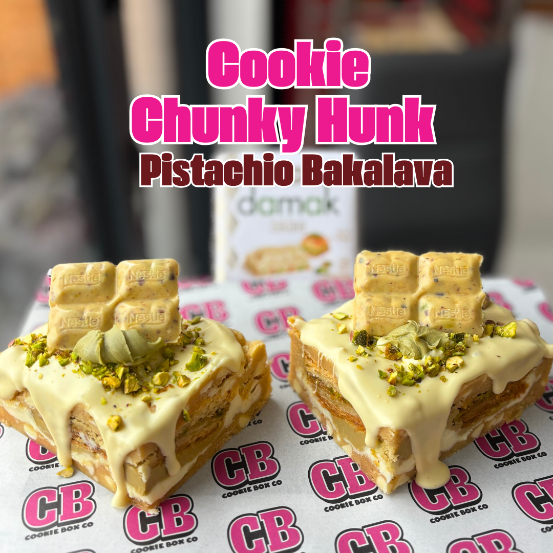 A white chocolate chunky hunk stuffed with MilkyBar ganache and a pistachio creme and then thick chunks of homemade Bakalava