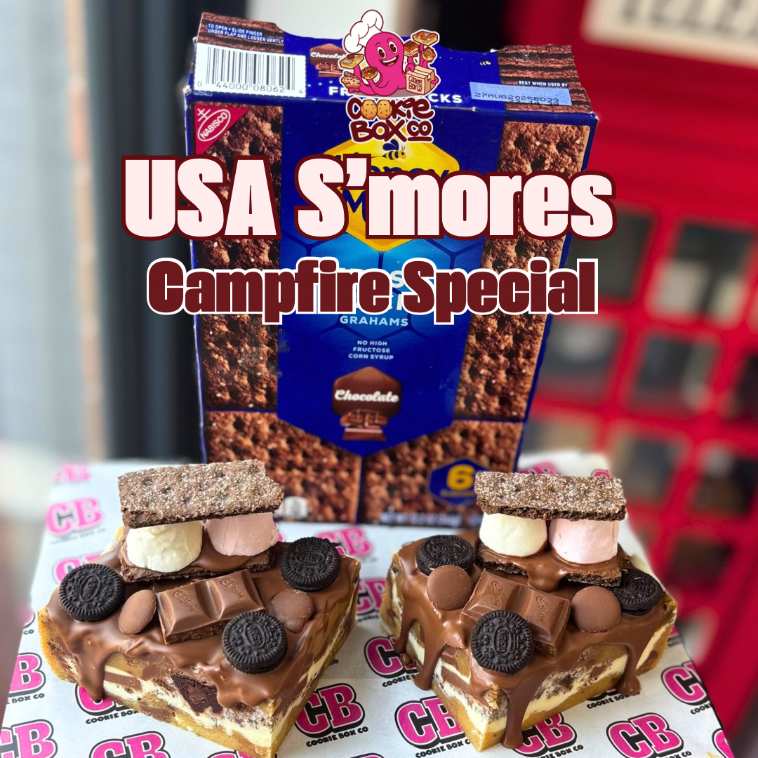 A combination of milk and white chocolate cookie dough laced with USA graham crackers, Oreo pieces and a new ganache of graham cracker. Topped with a traditional marshmallow s’mores, Oreo pieces and Cadburys chunk