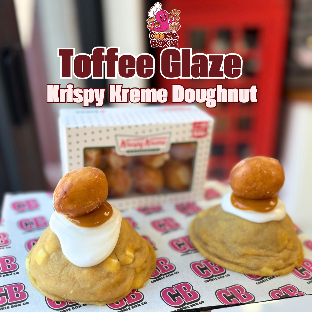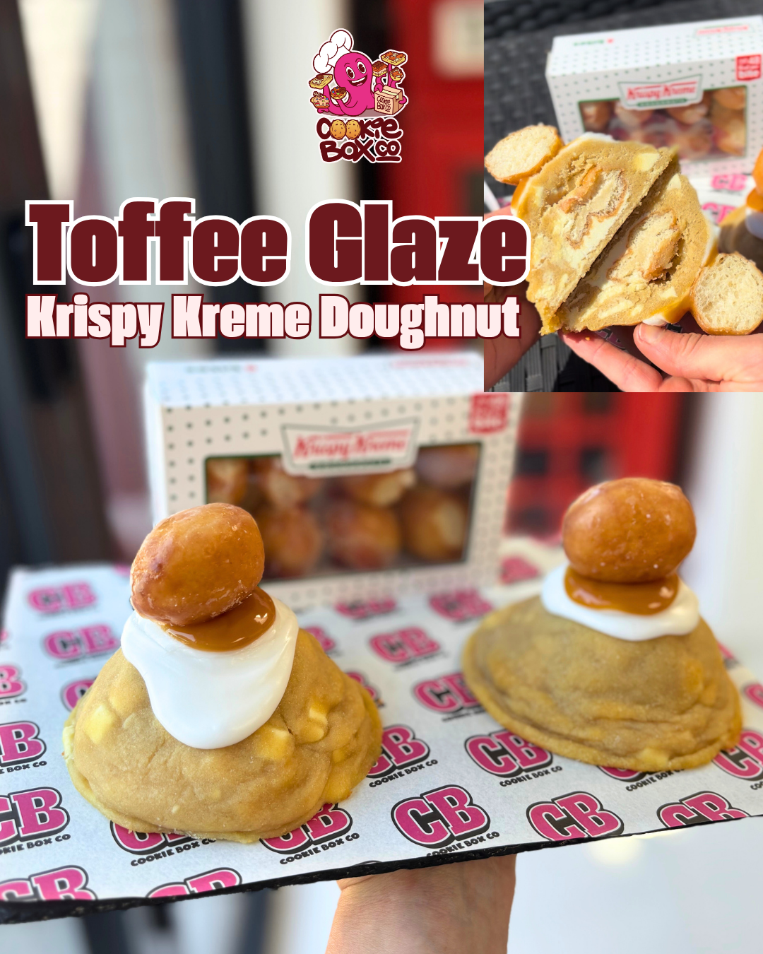 a white chocolate cookie 🍪 stuffed with a Krispy Kreme glazed donut hole and topped with the same on a bed of glaze and toffee sauce