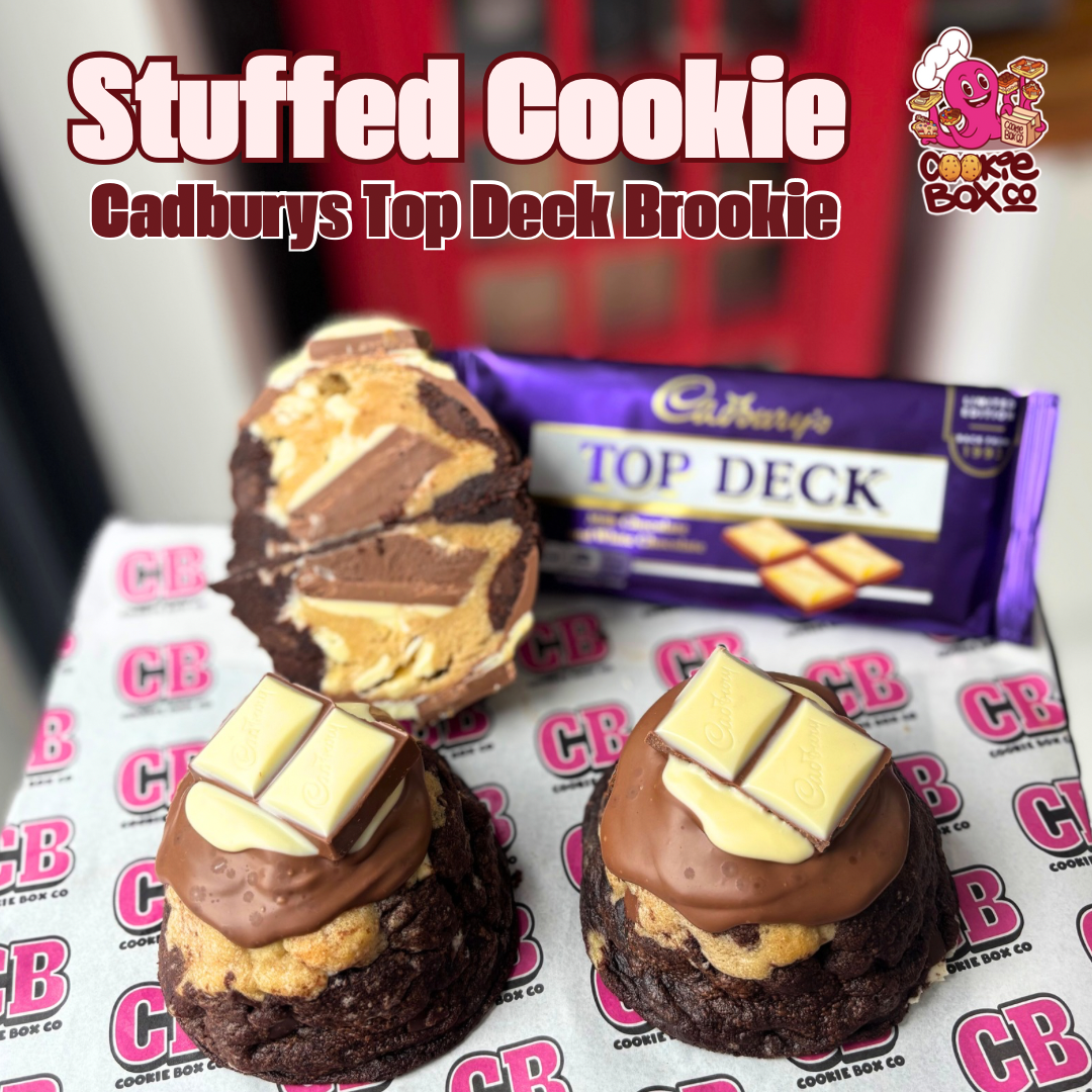This cookie combines brownie cookie dough milk and white chocolate. Inside you’ll find both milk chocolate dairy milk ganache and white chocolate alongside a thick layer of top deck. On top a slurry of milk chocolate, white chocolate and chunk of Cadburys top deck chocolate bar.