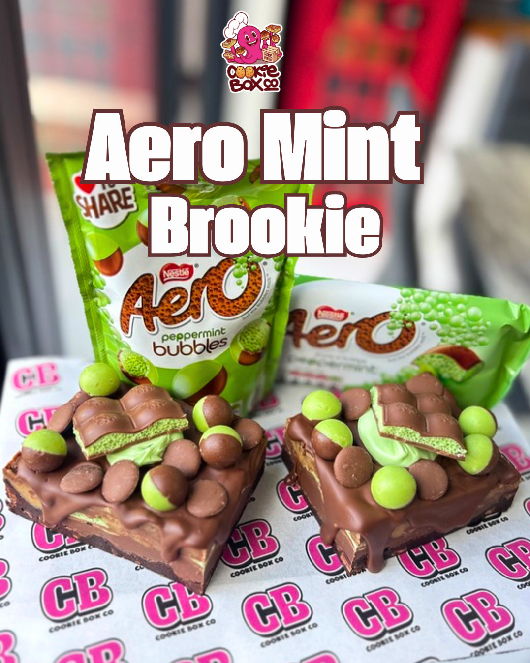 A combination of milk and brownie cookie dough the centre is a milk chocolate ganache laced with full bars of aero mint chocolate, on top milk chocolate, aero bubbles and aero mint bar.