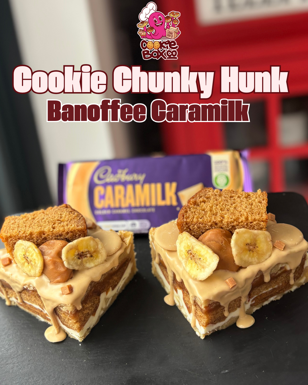 A white chocolate base or cookie dough. The centre is a banana loaf cake with caramel toffee and Biscoff spread. On top banana chips, banoffee loaf and Caramilk chocolate