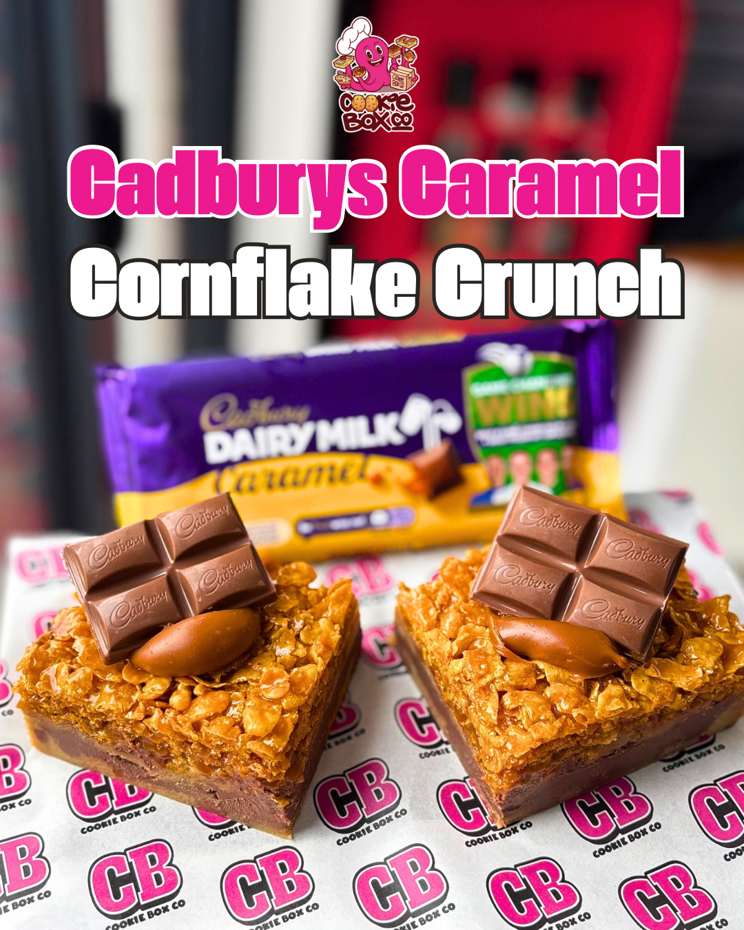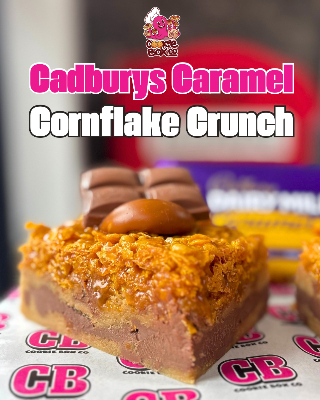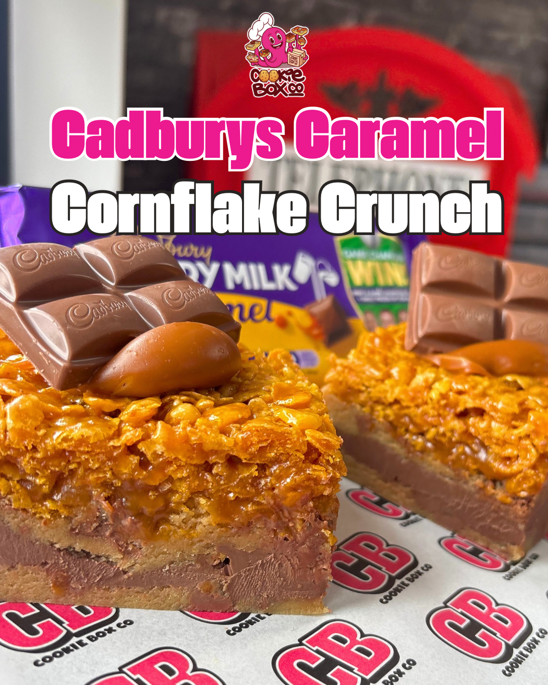 Milk chocolate cookie dough base with Dairy Milk ganache, topped with homemade caramel cornflake crunch, homemade caramel and Cadburys Caramel