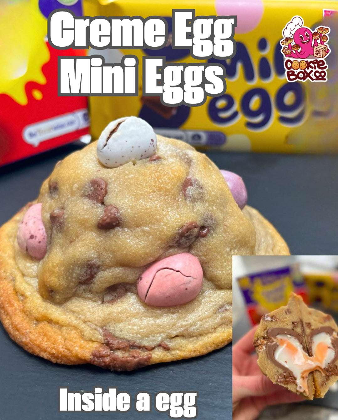 Mini Eggs - Creme Egg stuffed cookies. A milk chocolate cookie with a whole Creme egg in the centre and mini eggs in the dough.