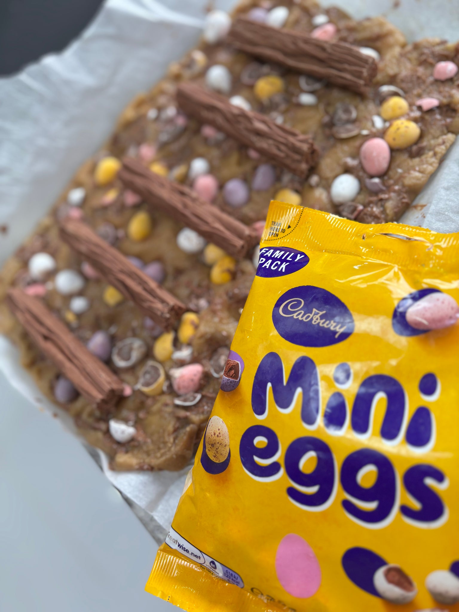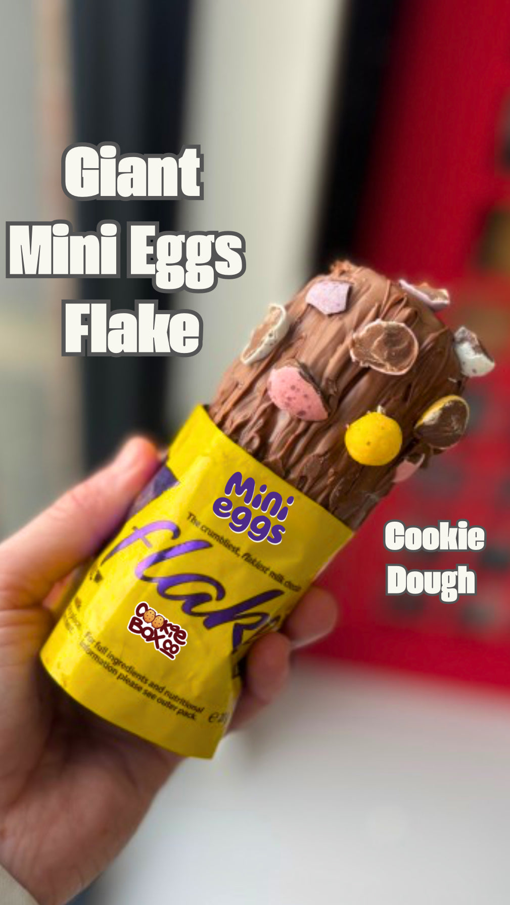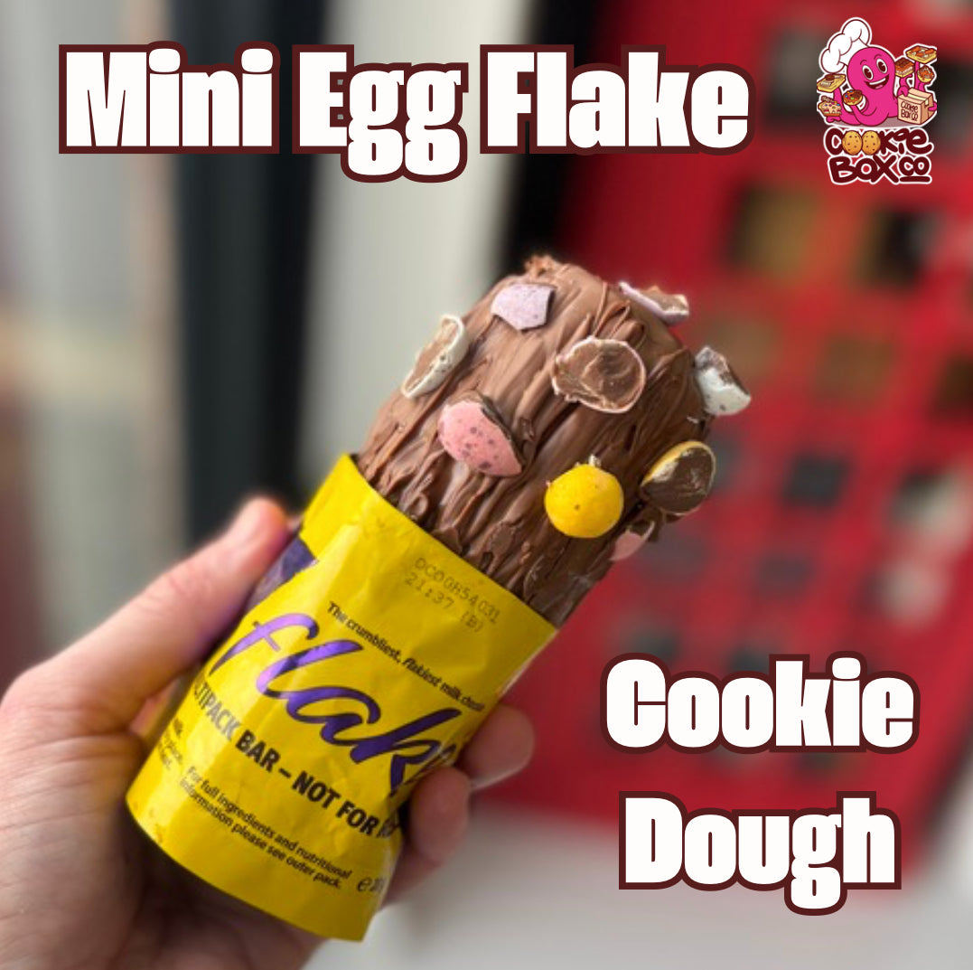 Cookie Box very own version of the flake. Giant in nature a flake inside stuffed around cookie dough with mini eggs in the dough. Covered in milk chocolate and mini eggs