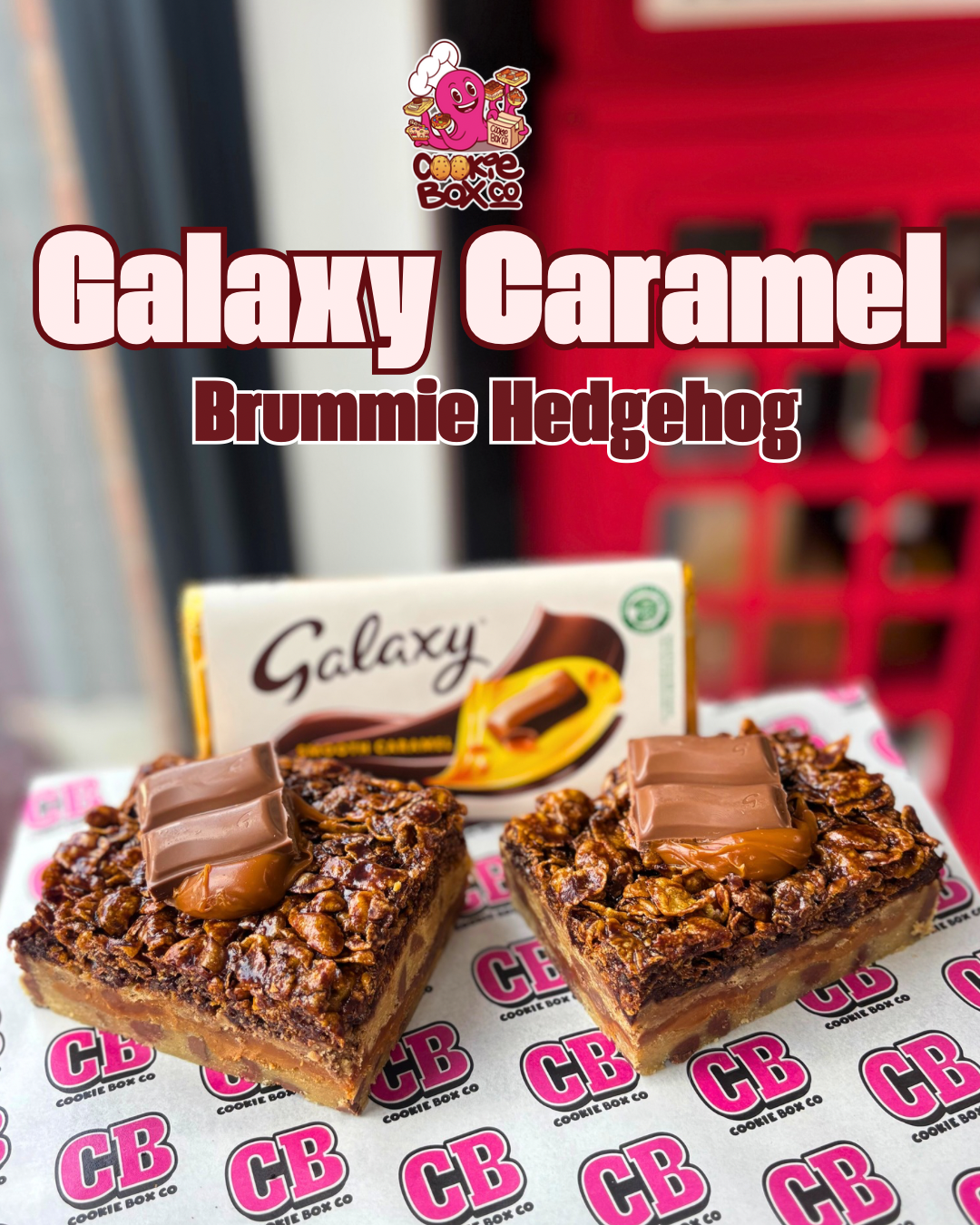 A brownie cookie dough base topped with a thick layer of caramel then milk chocolate cookie dough and then topped with the brummie special - “chocolate hedgehog” a rich cocoa caramel mix - think caramel cornflakes on CRACK