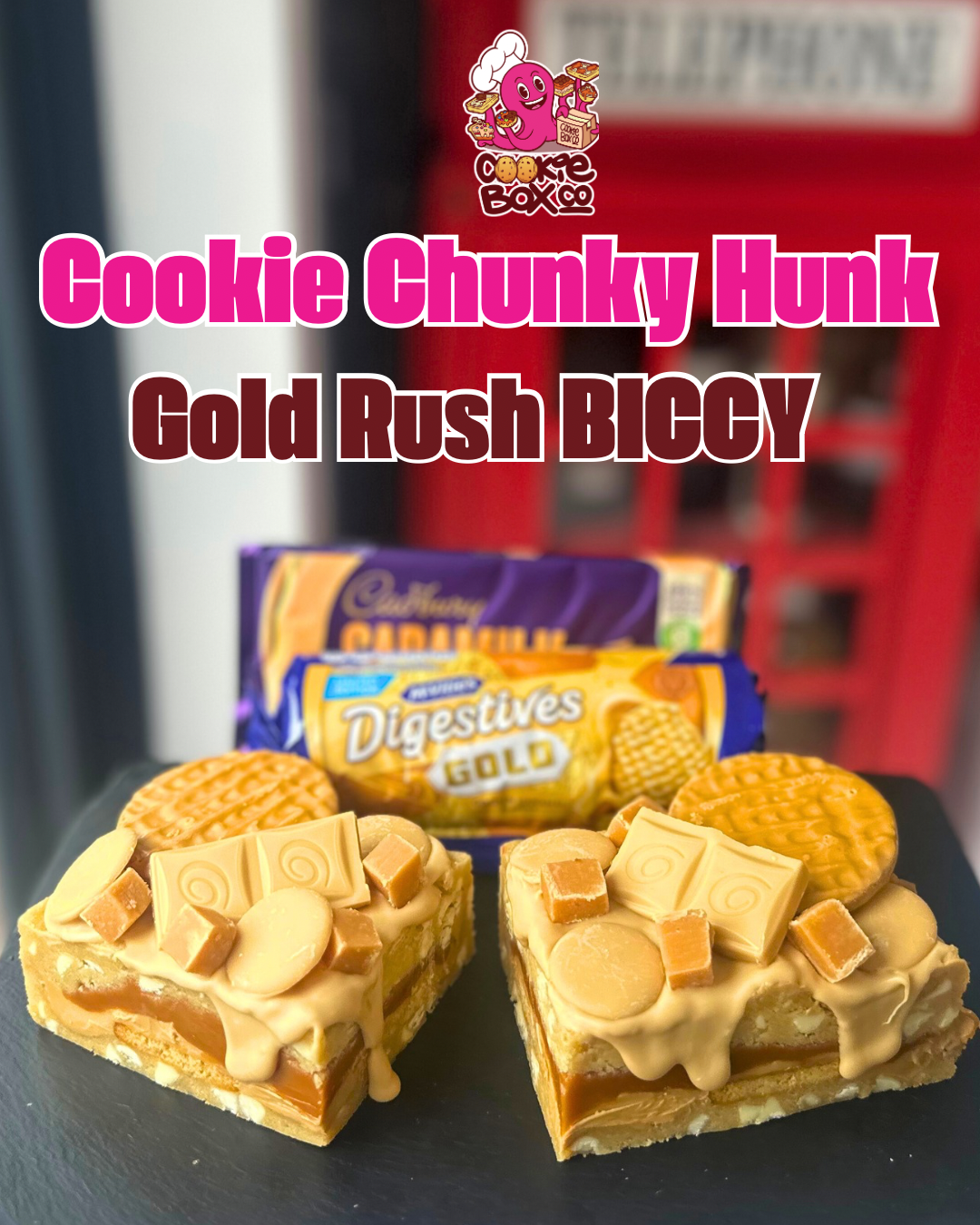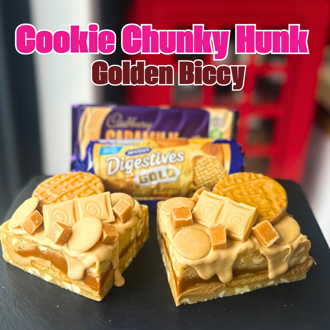 A white chocolate chunky hunk laced with Gold digestives in the base. The next layer is a thick golden blonde ganache and then homemade millionaires caramel which is topped with more cookie dough