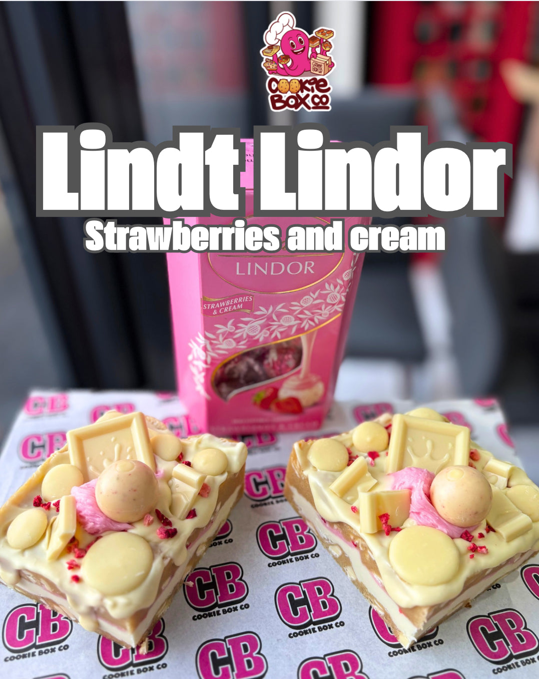 A white chocolate cookie dough chunky hunk with a milkybar ganache centre with a strawberry frosting swirl and freeze dried strawberry pieces. On top a slurry of white chocolate, MilkyBar and Lindt Strawberies and Cream.