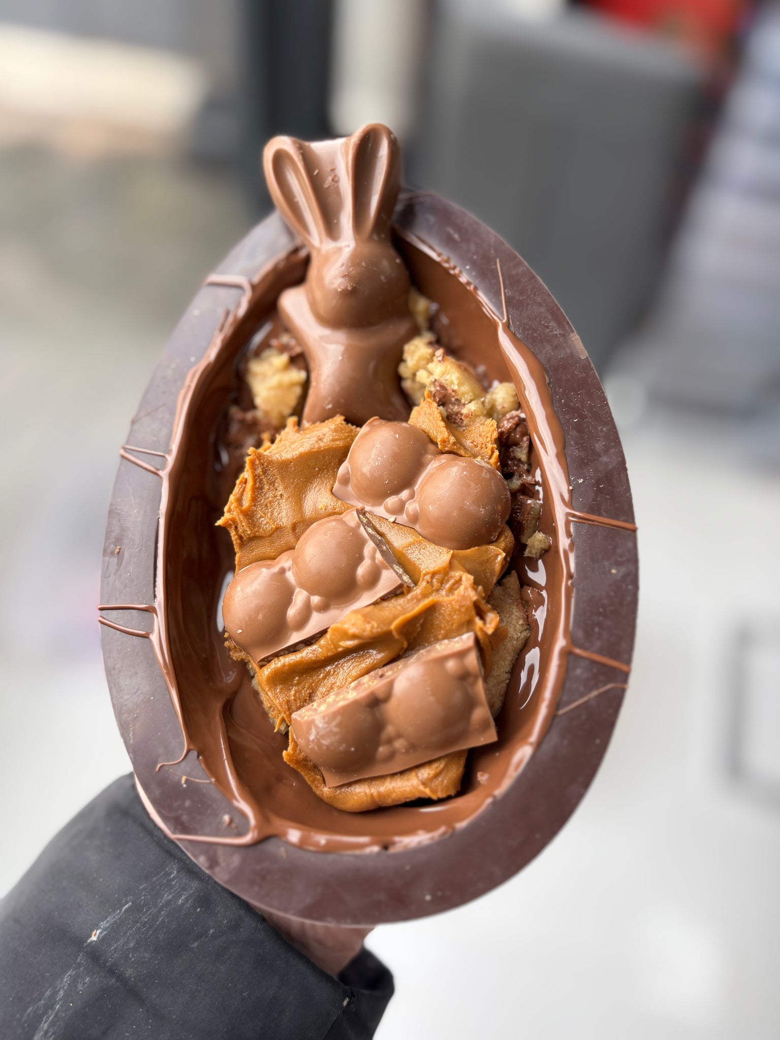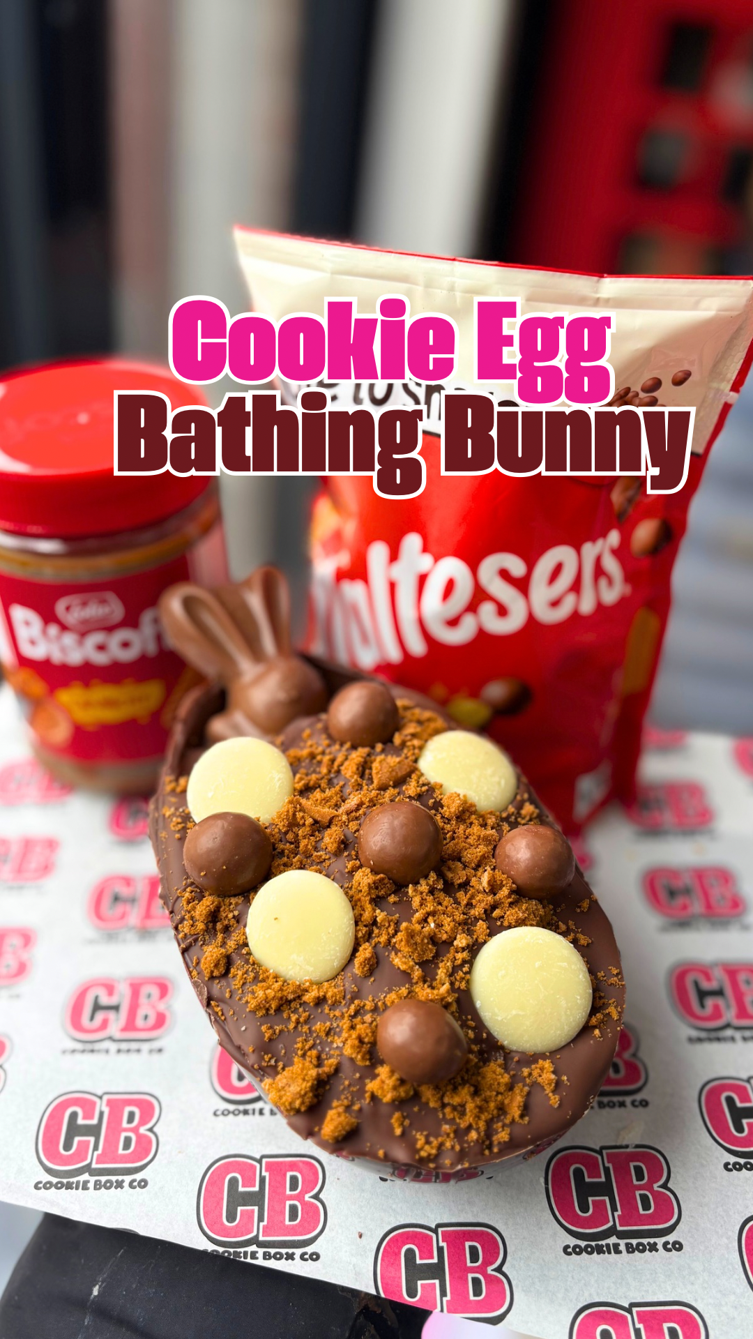 This is what we call the Biscoff bathing bunny. It’s a milk chocolate shell stuffed with milk chocolate cookie dough. In the base you’ll find Maltesers, Biscoff spread and milk chocolate cookie dough and a big Malteser bunny. On top milk chocolate, Biscoff crumb, Maltesers and MilkyBar buttons
