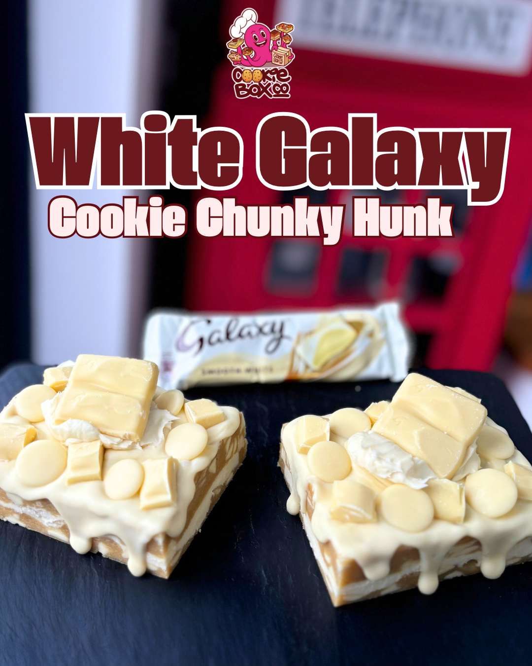 A white chocolate cookie dough stuffed with a white chocolate ganache topped with white buttons and white chunks of chocolate and white Galaxy