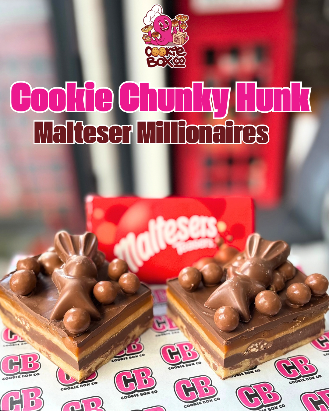 A milk chocolate cookie dough base layered with a milk Malteser ganache with chunks of Malteser bar inside this is topped with blonde ganache , caramel and then a thick layer of chocolate. This is topped with a Maltese bunny and Maltesers